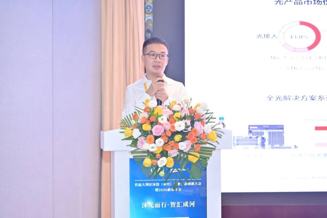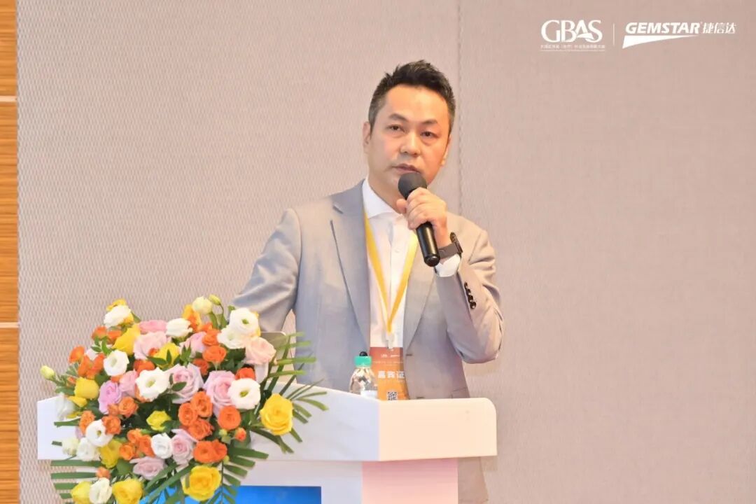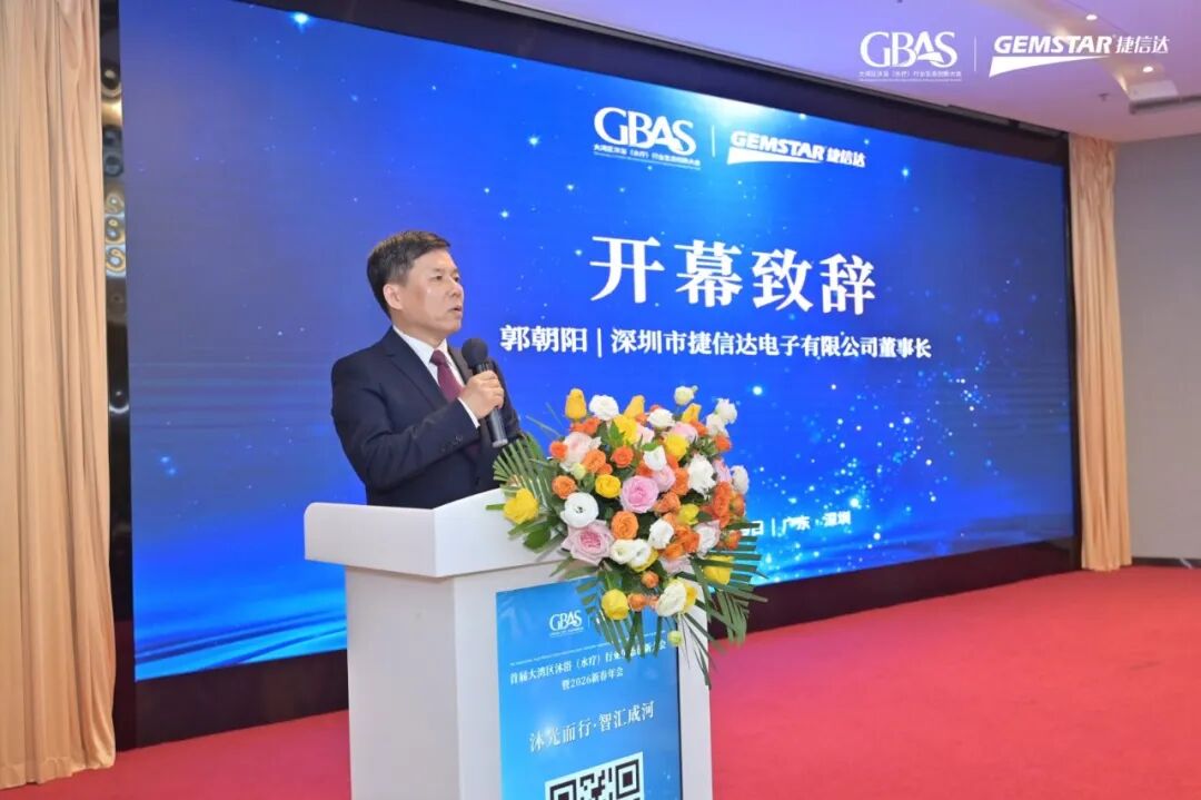 深圳市捷信达电子有限公司董事长郭朝阳发表开幕致辞。他回顾了沐浴行业在大湾区的发展历程,指出数字化和智能化转型已成为行业发展的必然趋势,并强调本次大会旨在搭建一个开放、共享的行业交流平台,推动产业链上下游的协同创新。