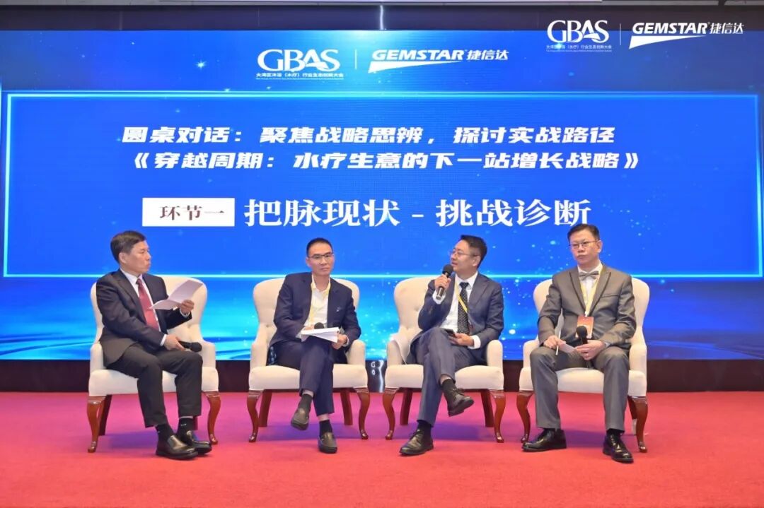 论坛最后一个环节——圆桌对话将会议推向高潮。由捷信达公司董事长郭朝阳主持,与对话嘉宾深圳阿奇拉汤泉生活雷其荣、水沐汤泉筹备顾问总经理朱文博、崎峪城市汤泉总经理杨森等业界领袖围绕"穿越周期:水疗生意的下一站增长战略"展开深度讨论,分享实战经验与战略思考。